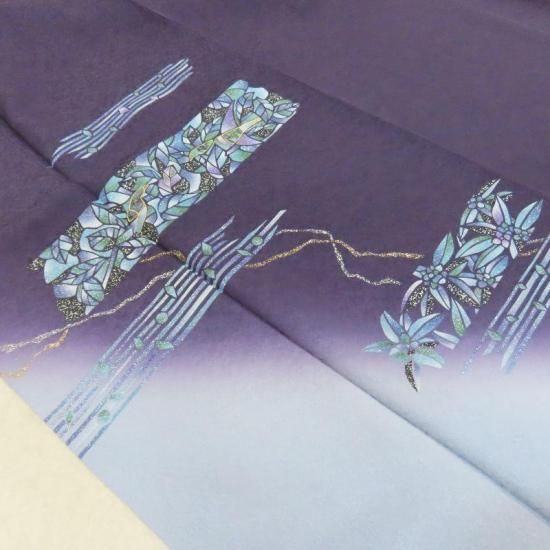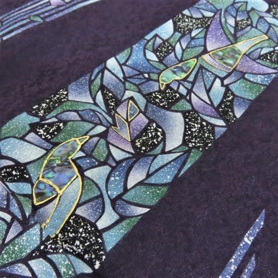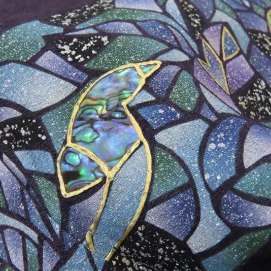 この金彩と螺鈿美術加工の美しさ・・海の宝石であるカット螺鈿を贅沢にあしらった美術染織です。