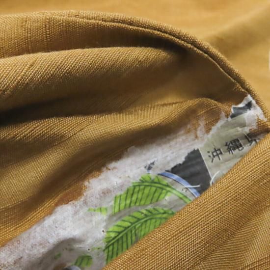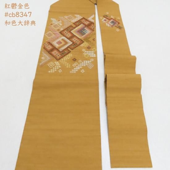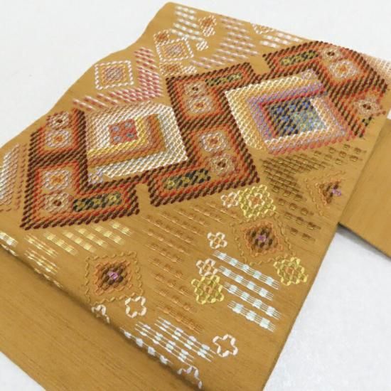 琉球らしい山吹色の帯地に美しい幾何学文様が広がります。