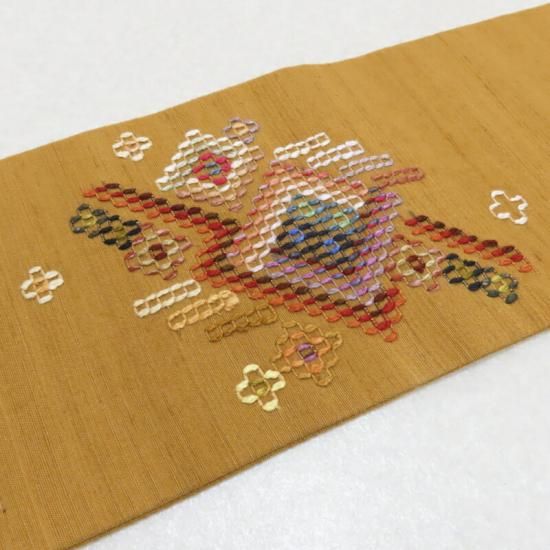 沖縄本島、読谷村で織られる花織。機織りで織描きだす琉球独自の自然美は正に伝統工芸品です。絹地のふくよかで優しい風合いは日常からお召いただくに相応しい帯です。