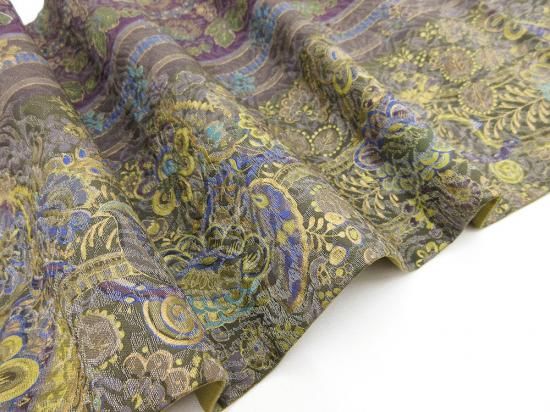 ご存知!京の名作家・【前田仁仙先生】の世にも美しい更紗の世界をお届けいたします。氏の作品と申しますと、シルクロードからヨーロッパ、南米を起源としたデザインを多く取り入れた他にはない色使い・意匠でございます。植物染料を用いて1枚にその色を表現し尽す正に美術染織の領域でございます。★1枚を染め上げるには恐ろしい技術と時間を要します。一枚の型紙に1色を引くために数十回と引き染をし色に深みと艶を与えていきます。 複雑な絵羽になると衣1枚に数百枚と言う型紙を用いて仕上げると言う工法でございます。 正にに神秘的・神業・・・ 是非、お手になさってくださいませ。