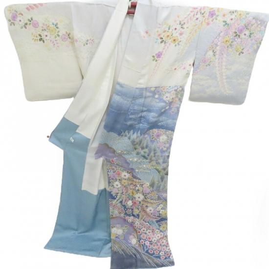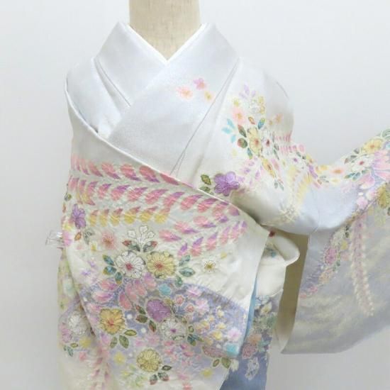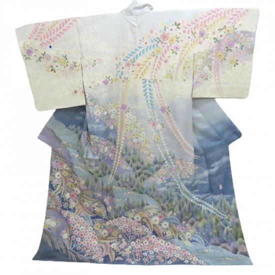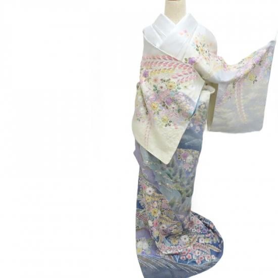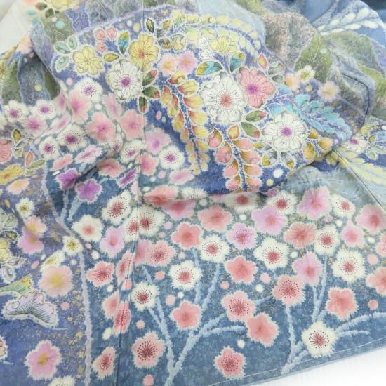 生地は透明感のある青磁鼠色。 生地全体に圧巻の辻が花文様が浮き立ちます。