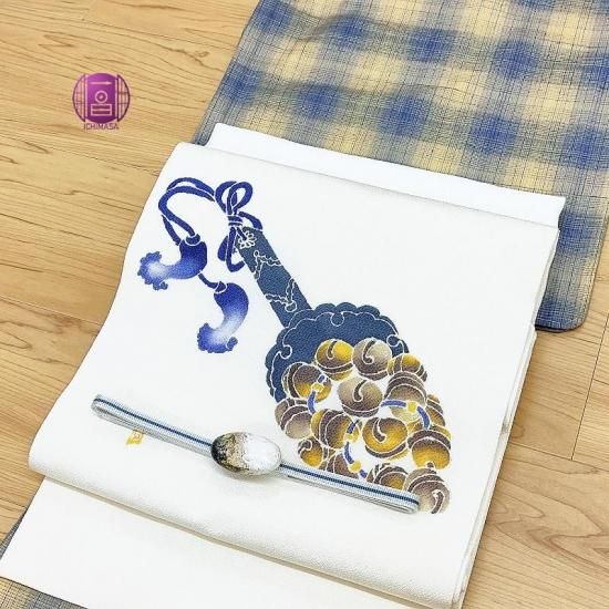 神聖な神楽鈴を描いた作家物の九寸名古屋帯です。