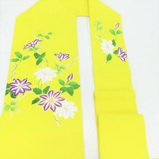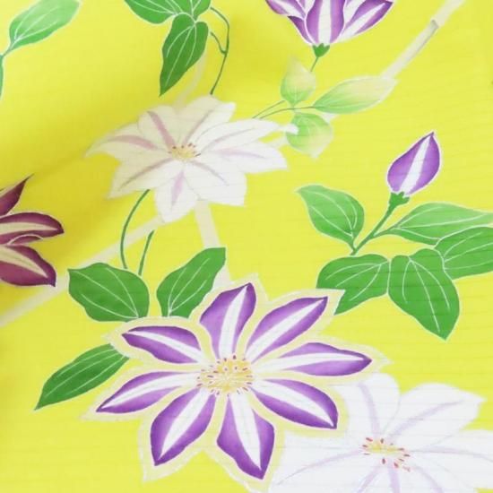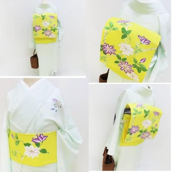 檸檬色の地に染められたクレマチス(鉄線)は夏の太陽の力を得て秋へと誘う美しく凛とした女性像をイメージしていただけるのではないでしょうか。