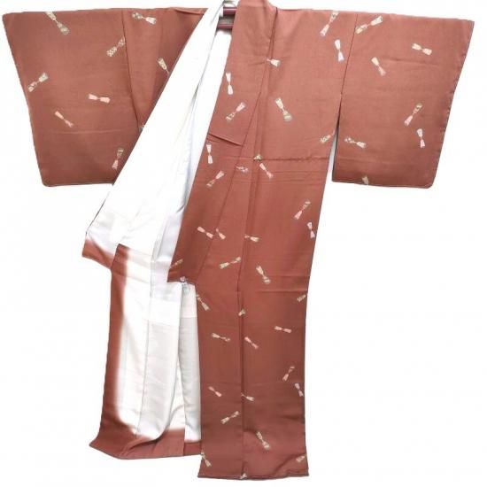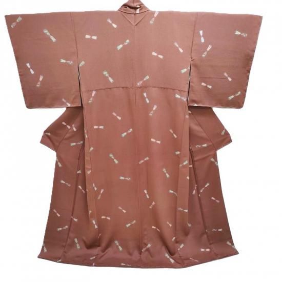 静かな美しさを装う和柄を飛び柄に配した染めの小紋です。