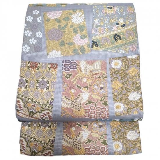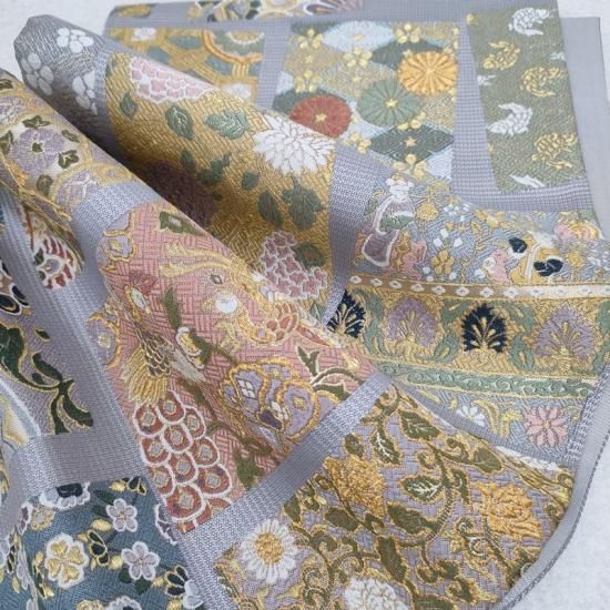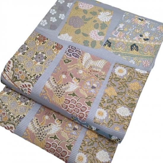 本品は正倉院文様と名物裂文様を織りなした色紙紋です。