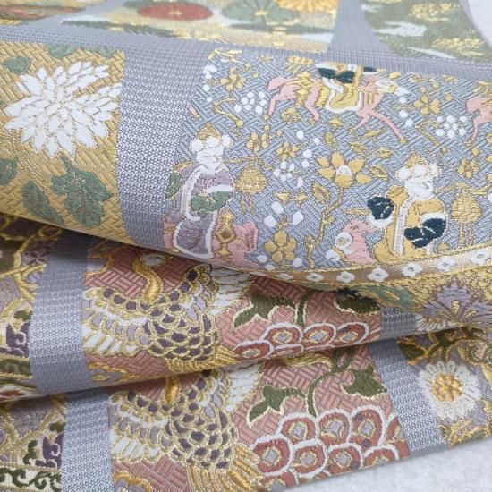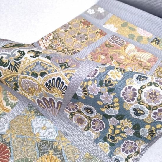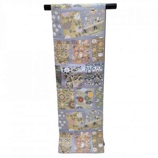 規則的な枠の中に美しい文様を置いています。ですので全体のイメージが崩れないきちんと感がご披露頂けます。柄の多い帯を敬遠なさる方にもお気に召して頂けるのではないでしょうか。唐織は主にフォーマル帯としてコーディネートされることが多く、帯の中でも特別な存在として1本はお勧めしたいアイテムです。