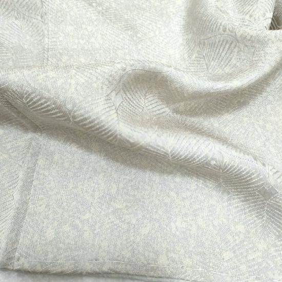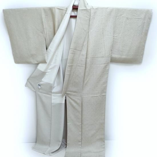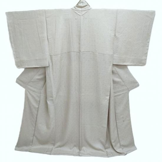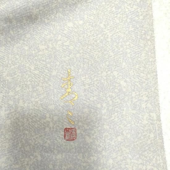 繊細な松葉文様を織りなした生地を用いあえて無地の蒔き糊染めに仕上げた贅沢な衣です。文様がない分、繊細な蒔き糊染の技術の高さがハッキと御覧頂けるかと思います。作家物ならではの意匠ではないでしょうか。