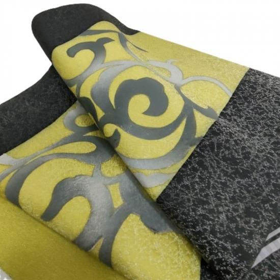 技法はロウケツ染、ダマールの木の樹脂を使用して染める「ダンマル染め」など神秘的で造形物をそのままデザインに落とした様な立体感は見事です。