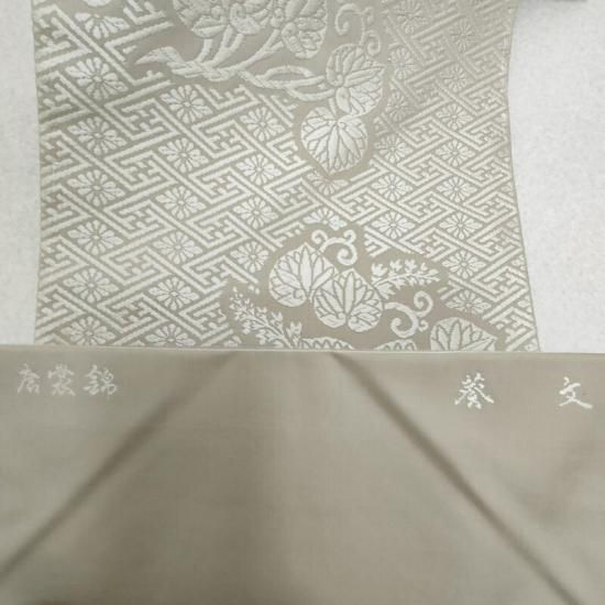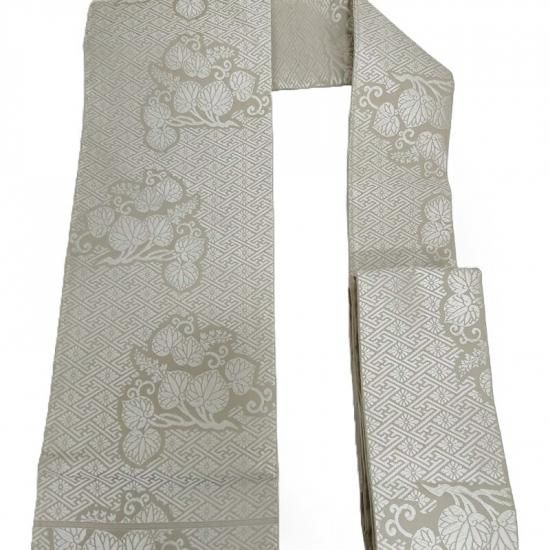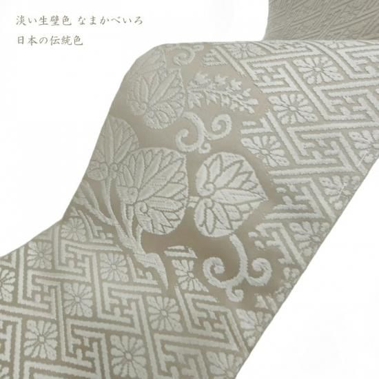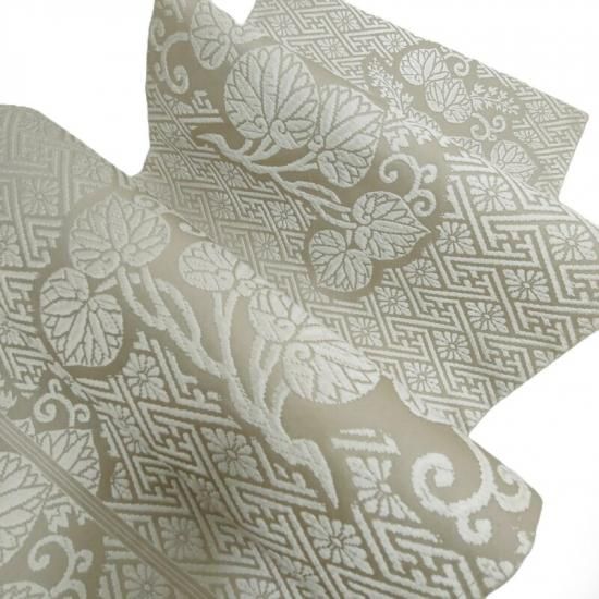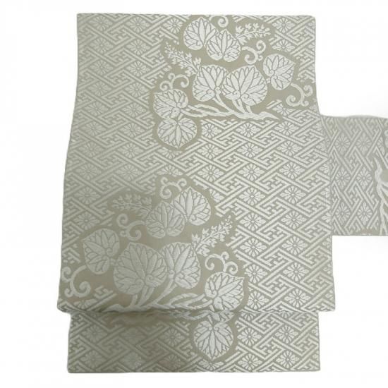一色の糸で凛と織りなした葵紋がとても印象的な一品。高尚なその意匠は名古屋帯にして優れた品格を漂わせる順礼装にもお召いただける品質です。