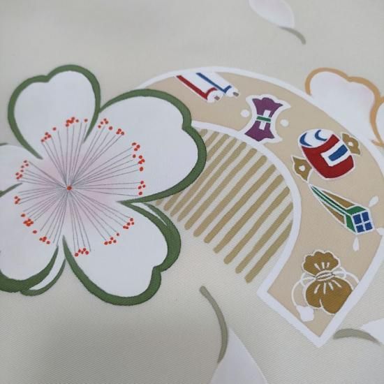 可愛い表情で咲く花とかんざしを描いています。かんざしには宝尽くし文様が置かれています。
