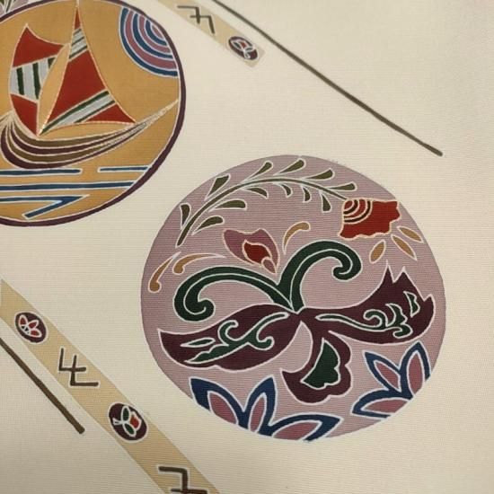 丸紋の中に丁寧に花と抽象画的な文様が描かれています。