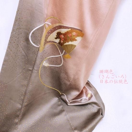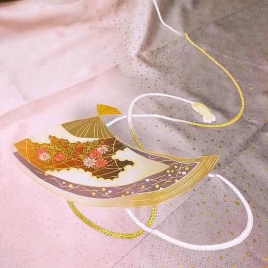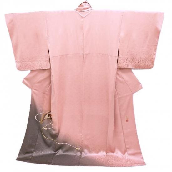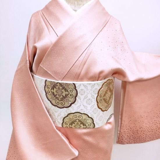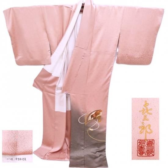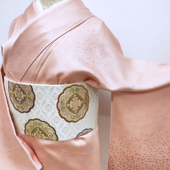 裾元から身頃に立ち上がる自然な裾ぼかしに上品な小粒の箔を丁寧に丁寧に置き一枚の文様に仕上げた染色は象徴的な文様の中には着る人を主役とするイメージの世界をお感じいただけるのではないでしょうか。
