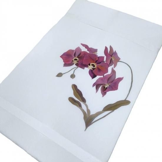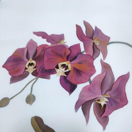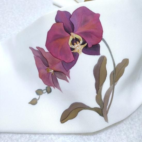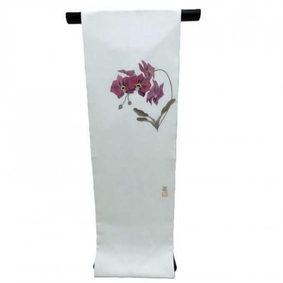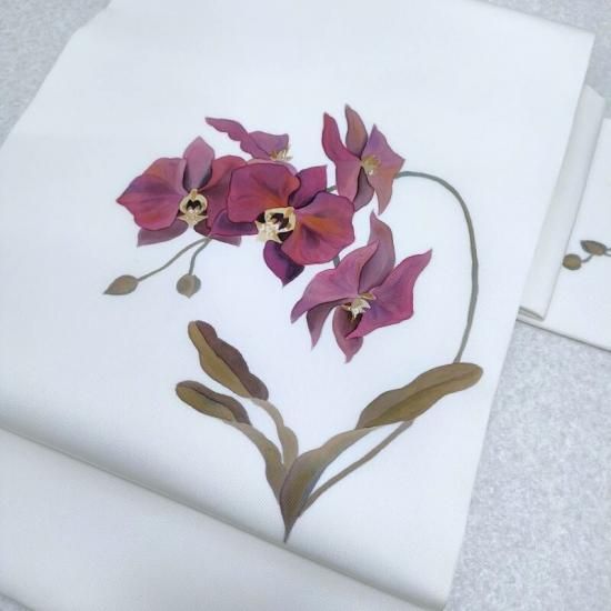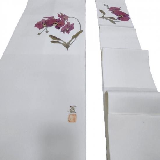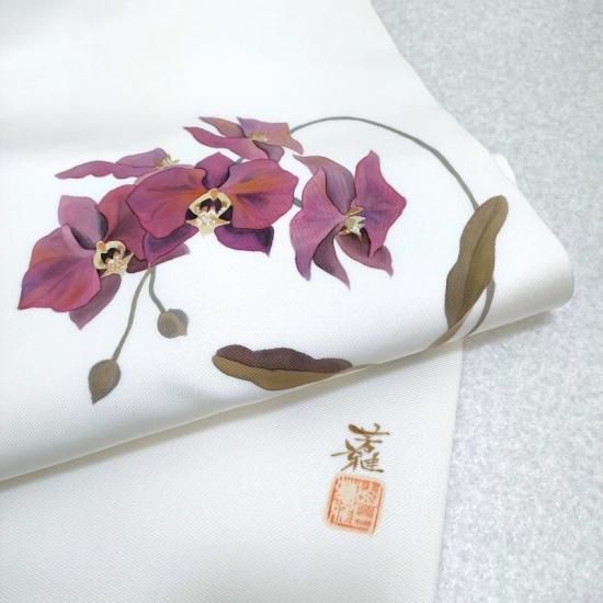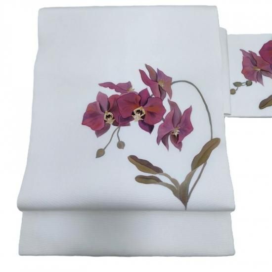 作家物の手描き染めです。ずっしりと重厚な塩瀬の帯地にまるで絵画のごとく描かれた胡蝶蘭が印象深く装いに静かな花を添えるお勧めの一品。