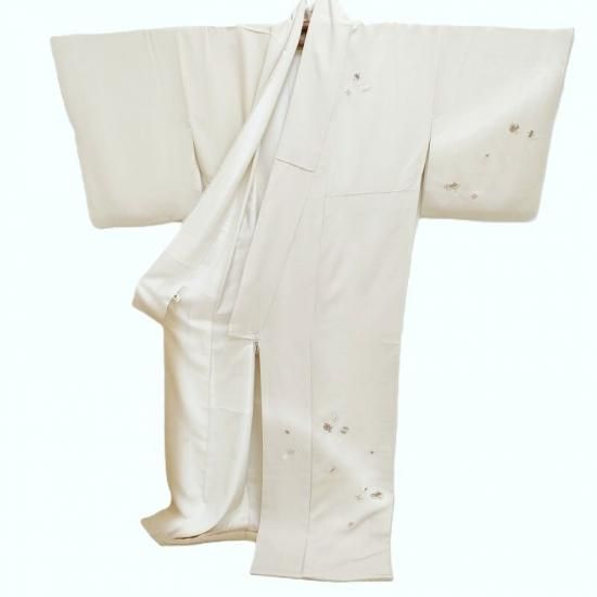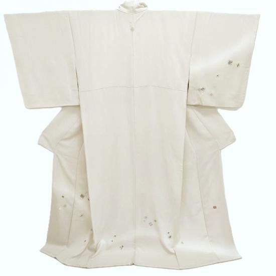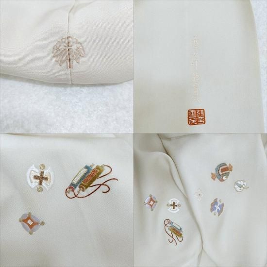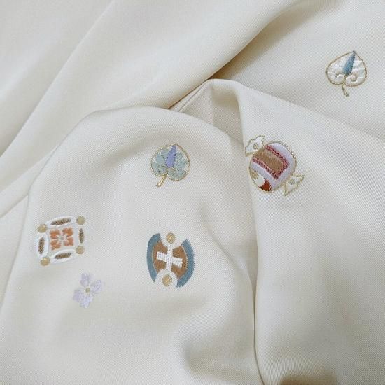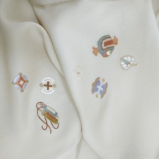 縁起文様を代表する宝尽くし文様を刺繍で置いた日本的で清楚な紋付の付下げです。