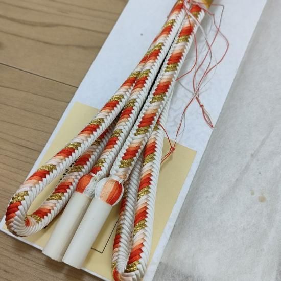 手染であること、手組であること、いかに美しく見せる事。 随所に尽くされたこだわりの手組紐です。 組紐の組方は数百種類にも及びますが、大きく分けると薄くて幅広の平組と、丸みを帯びて厚みのある断面の角組に分類されます。