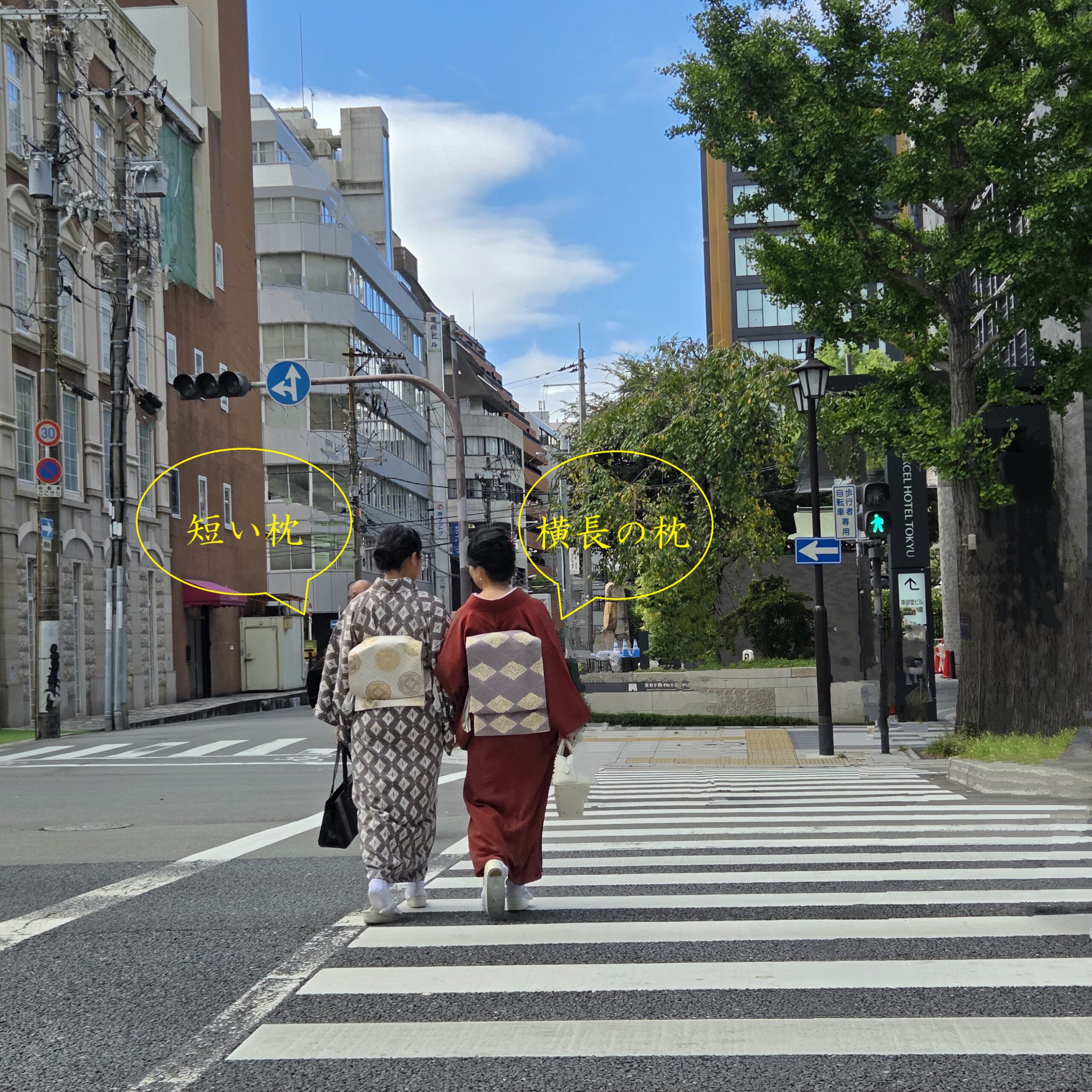 ●下の写真↓では、向かって右側の赤い着物(伊藤)が「横長の帯枕」